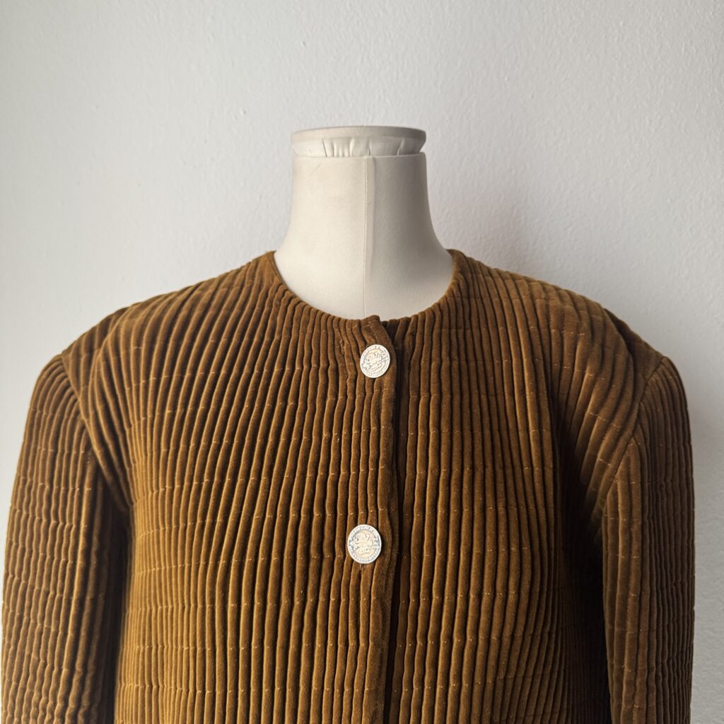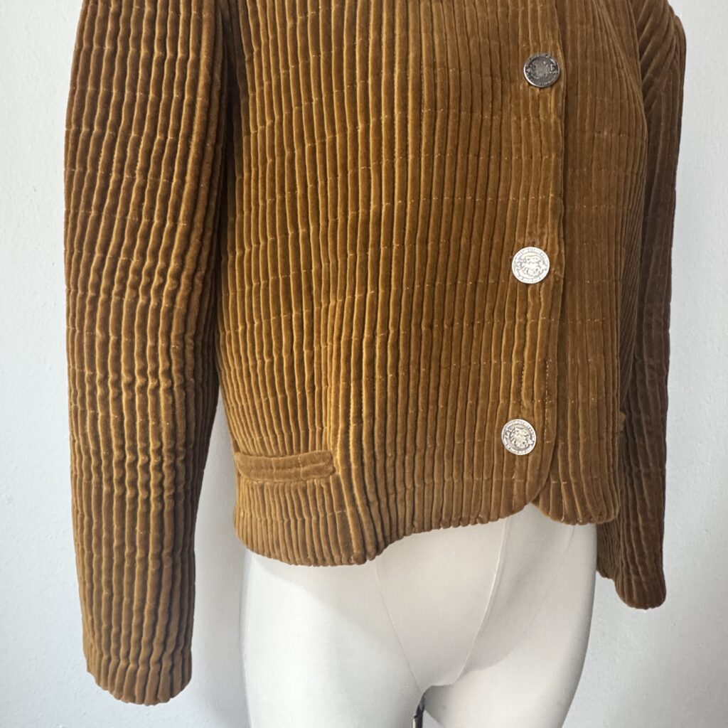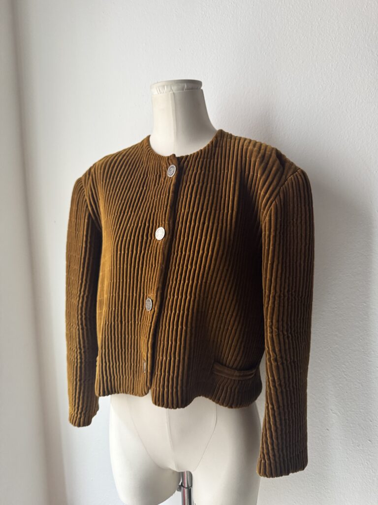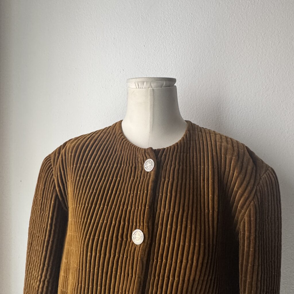 Giacca vintage sartoriale realizzata a mano in velluto a costa larga, con dettagli curati e bottoni effetto moneta che ne valorizzano il carattere artigianale.