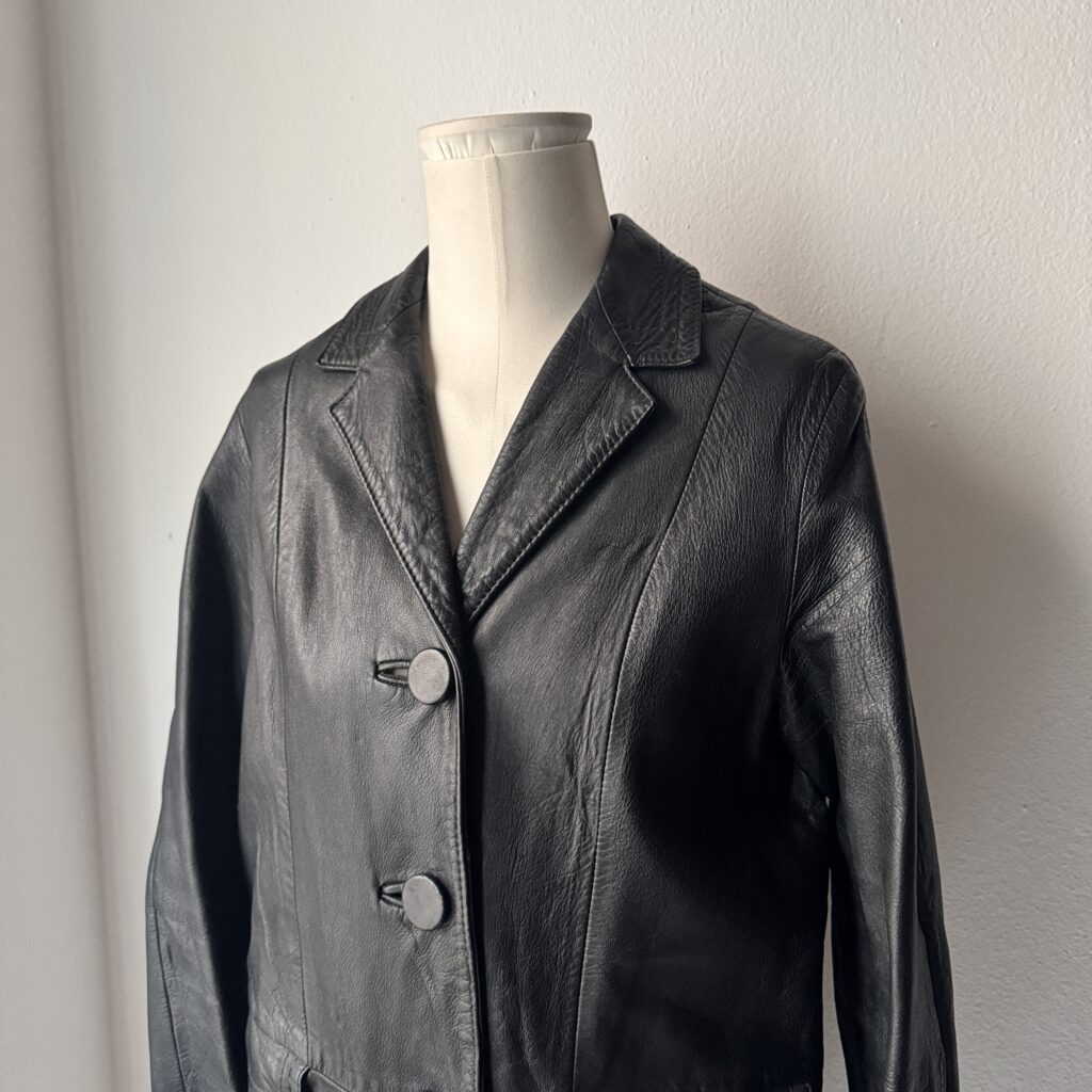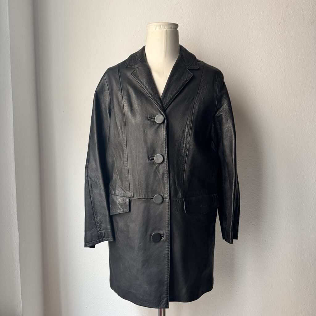 Giacca vintage anni ’90 in vera pelle, dal taglio dritto e linea midi, perfetta per chi ama i capi decisi ma senza tempo.
